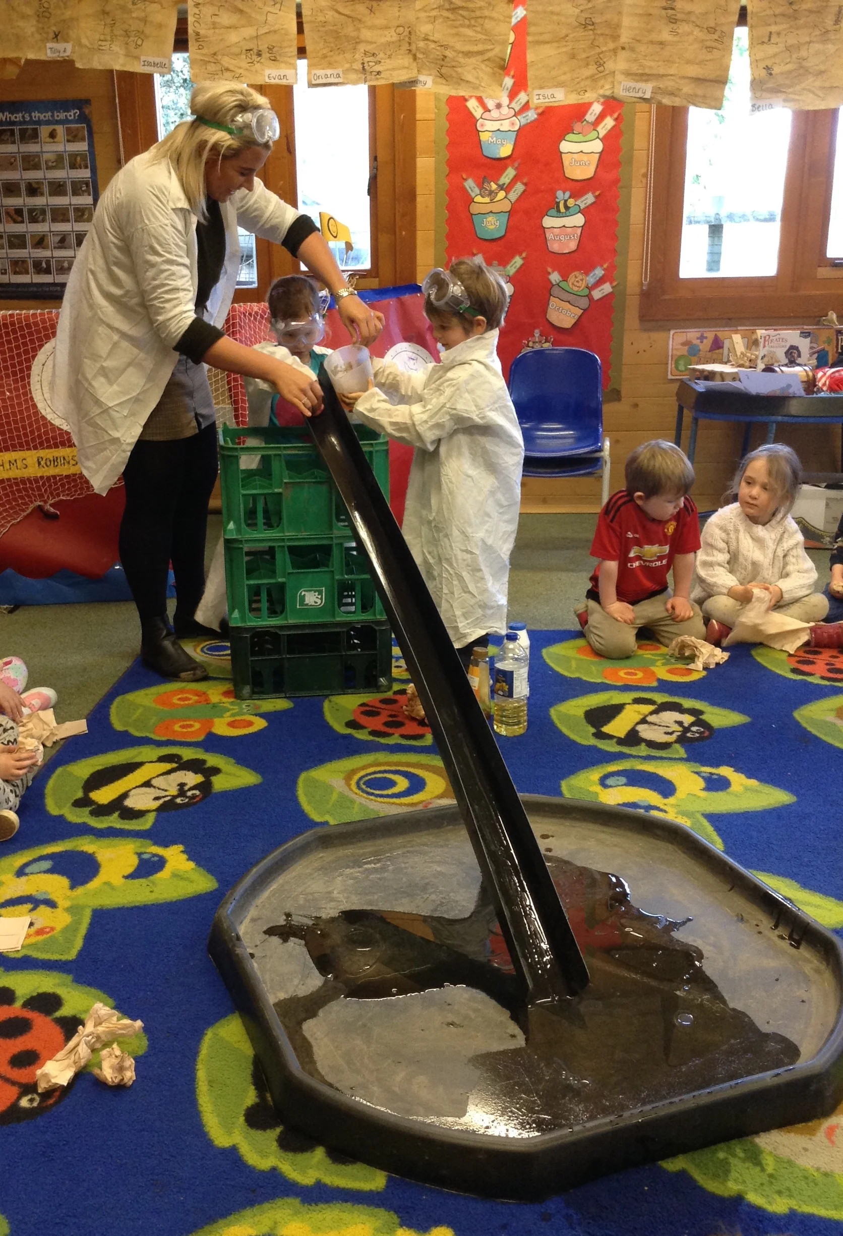 Today Robins’ became scientist. We used different liquids to see how fast our duck could slide down the ramp. Guess what… water made the duck move down the ramp the fastest (2 seconds)and syrup was the slowest (2 minutes).