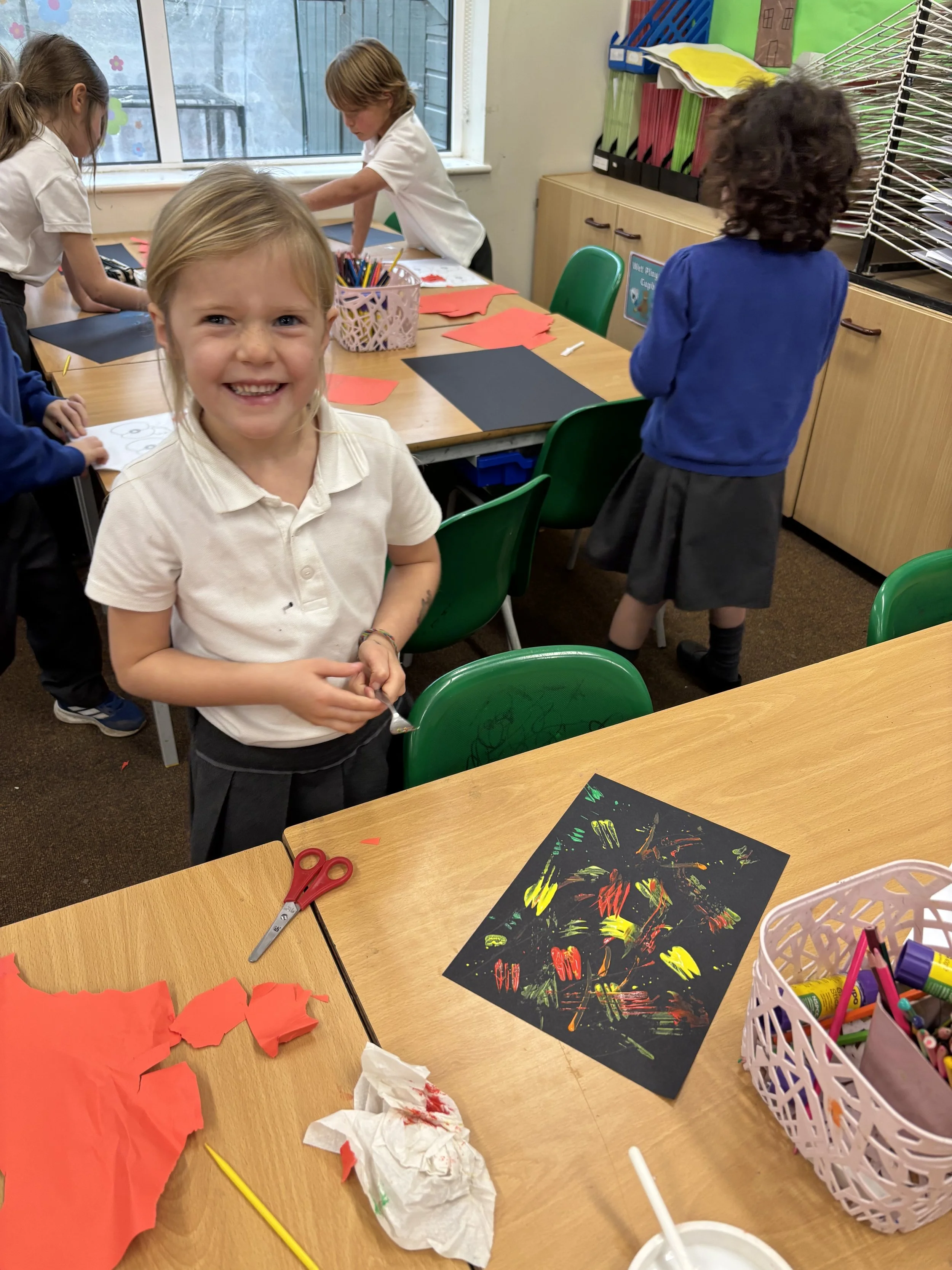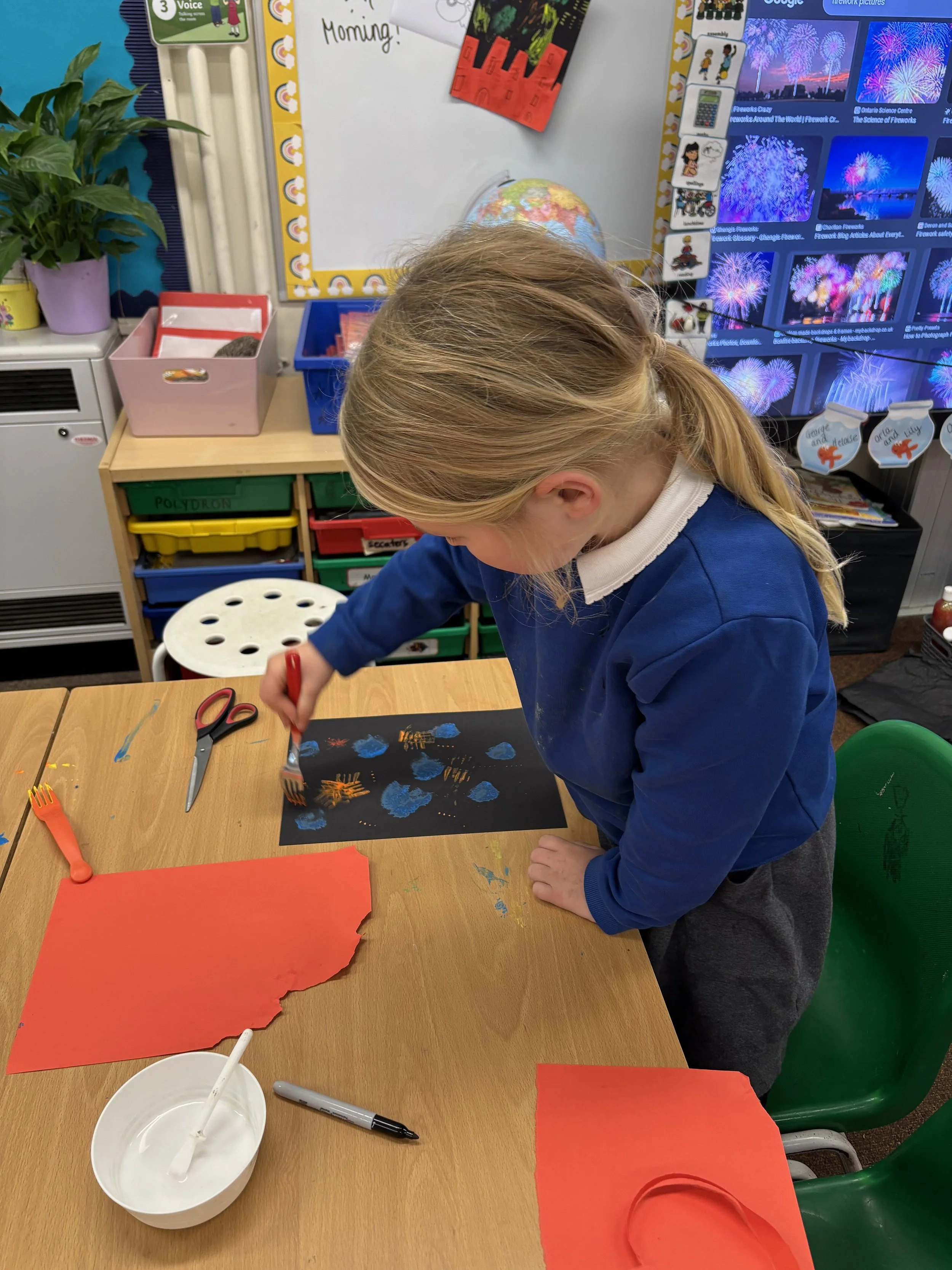 On Wednesday, Hedgehogs had a fantastic afternoon full of History and Art. Year Two learnt about fireworks night and why people celebrate this tradition on the 5th November. We explored the gun powder plot story (which was very interesting and sparked lots of questions), learnt a rhyme to remember the 5th of November and then made beautiful firework pictures using a range of materials. Year Two used different coloured paints, textured paper and even added glitter to create their fireworks! It was such a fun afternoon. The artwork looked brilliant and so realistic too. Each creation was so individual and the end result was really effective. Have a sneak peak below…