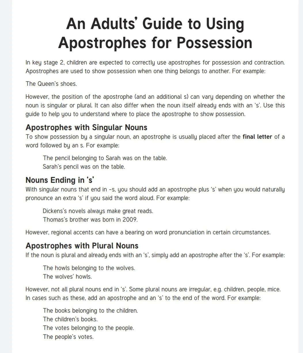 We have looked at using apostrophes for possession before. This is where apostrophes are using to show when something belongs to someone. For a reminder: