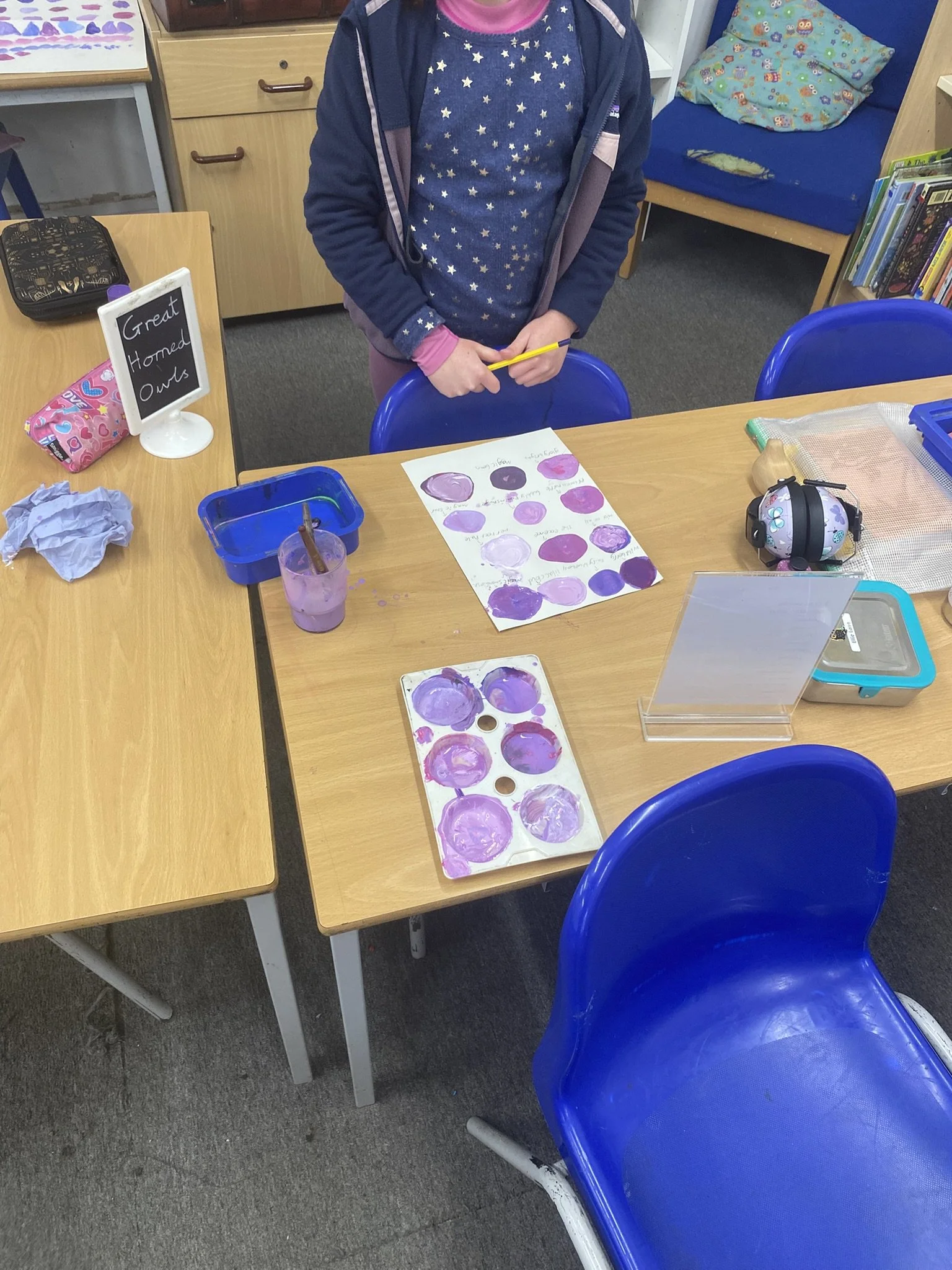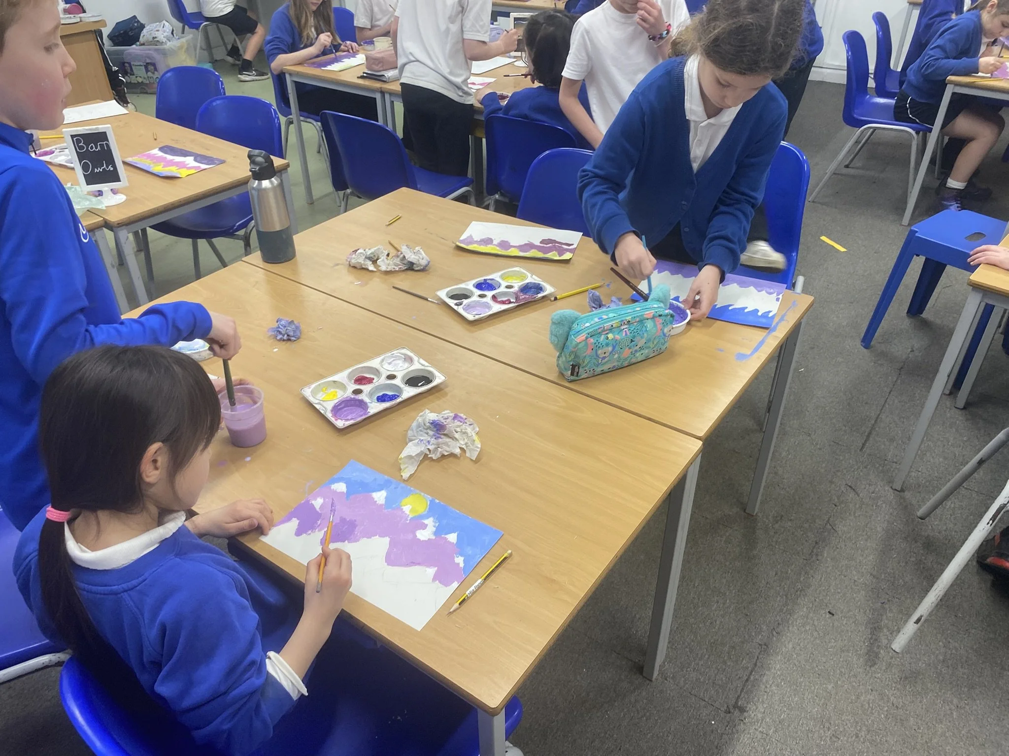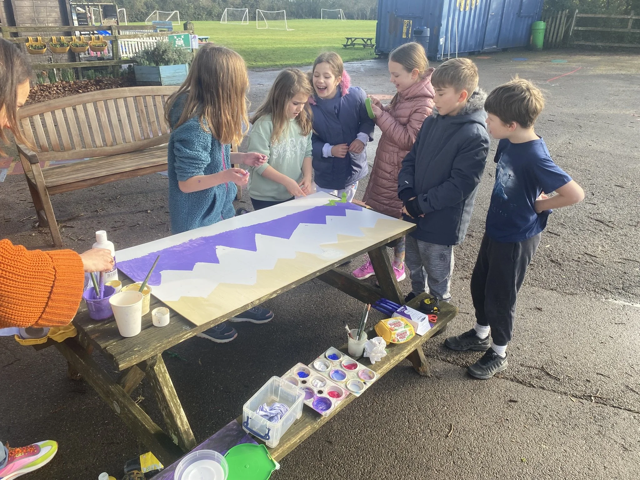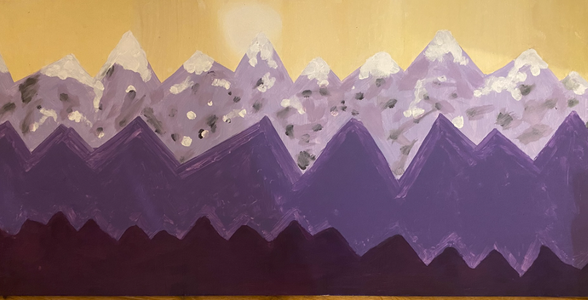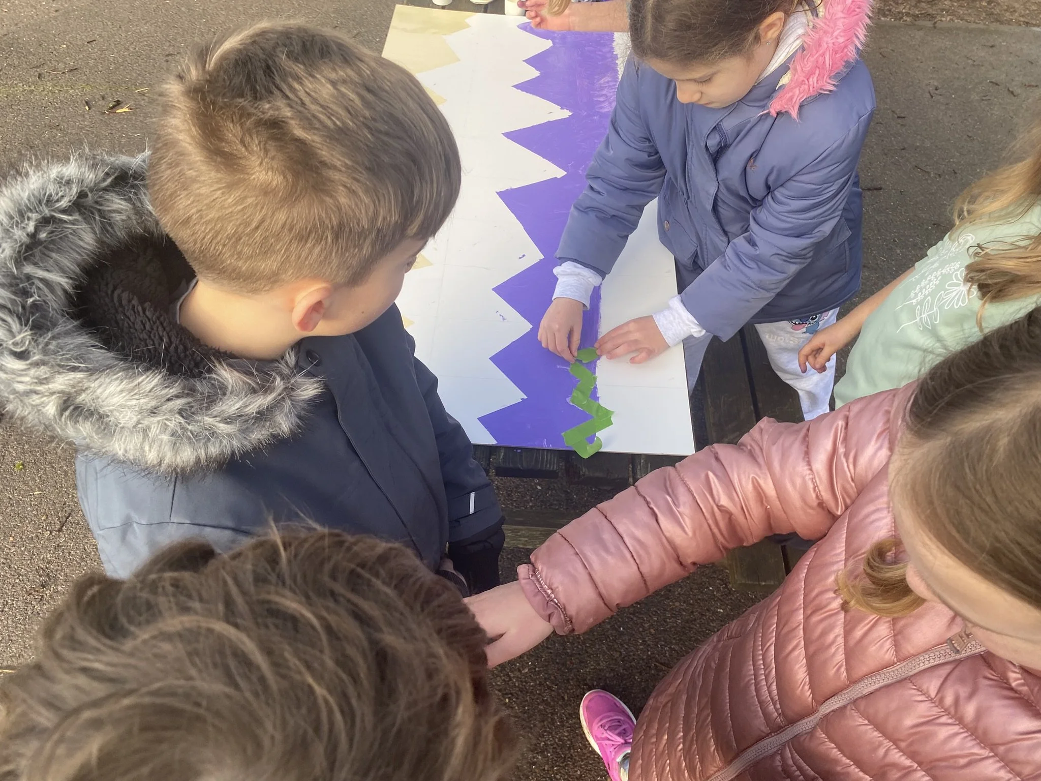 We’ve had a brilliant time in art week, exploring the colour purple. This fit well with our current topic Misty Mountain. We were delighted to have Helen Brady join us for a morning to take us through creating our very own mountain mural. Thank you Helen! We learnt how to mark lines with masking tape and all the children were involved putting paint on the board.